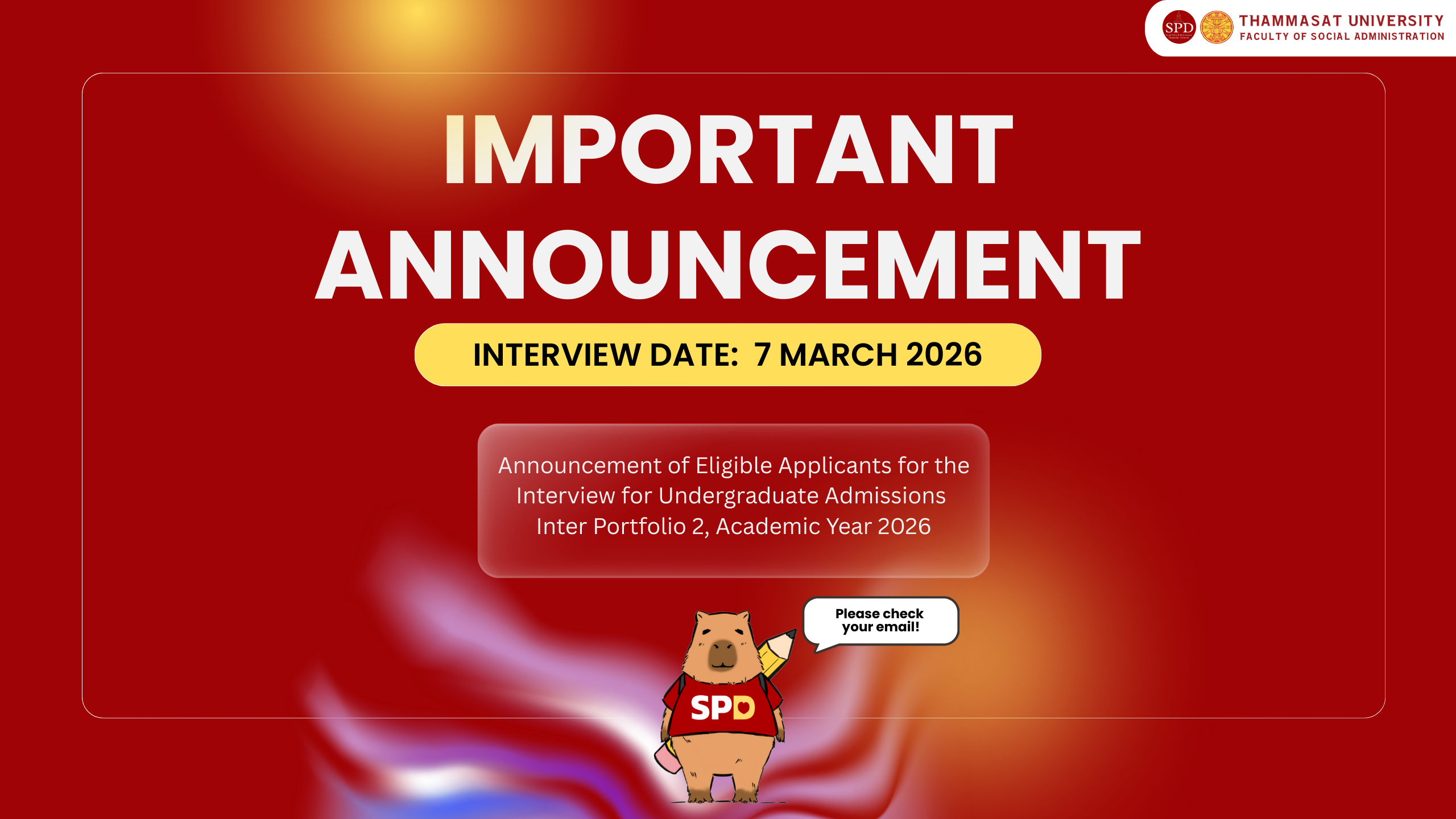 According to Thammasat University’s announcement dated 14 October 2025 regarding admission in the Bachelor of Arts in Social Policy and Development (International Program), Faculty of Social Administration, Academic Year 2026, Inter Portfolio Round 2, on 24 February 2026 the University had scheduled the announcement of eligible applicants for the interview.